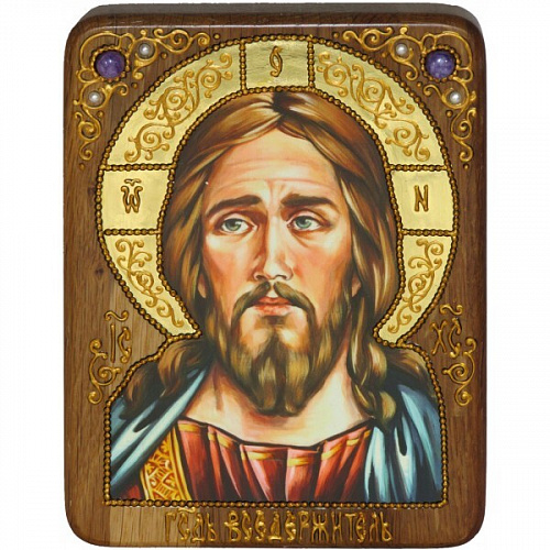Икона "Господь Вседержитель" на мореном дубе с нимбом из сусального золота в березовом киоте