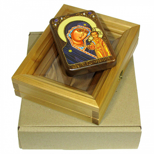 Икона "Казанская икона Божией Матери" на мореном дубе с нимбом из сусального золота в березовом киоте